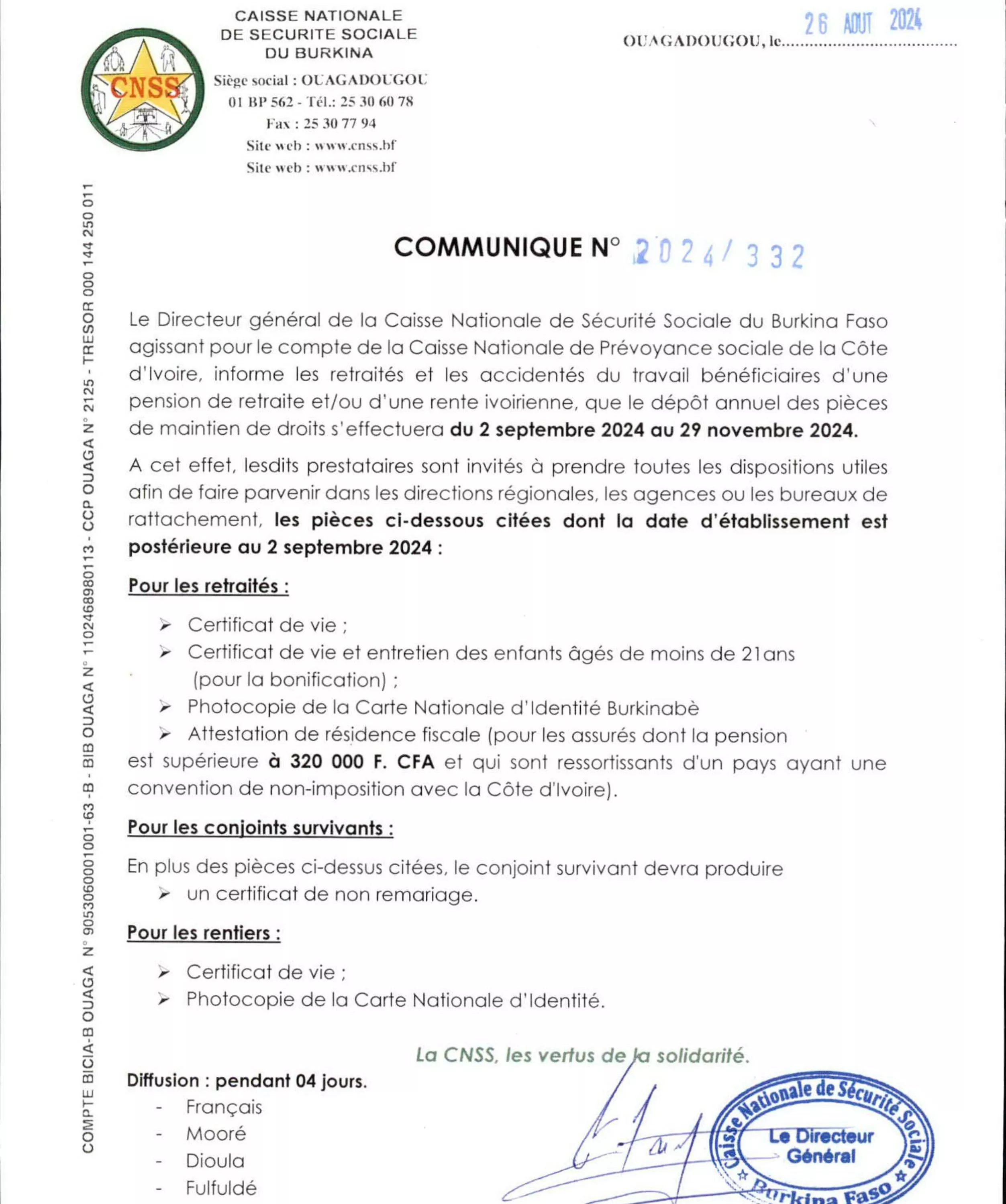 Communiqué N° 2024/005/DG/SG/DCR portant date limite de paiement des cotisations sociales