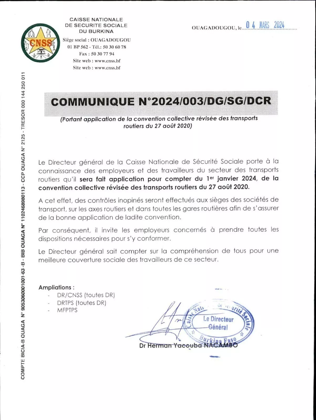 Communiqué N°2024/003/DG/SG/DCR portant application de la convention collective révisée des transports routiers du 27 août 2020