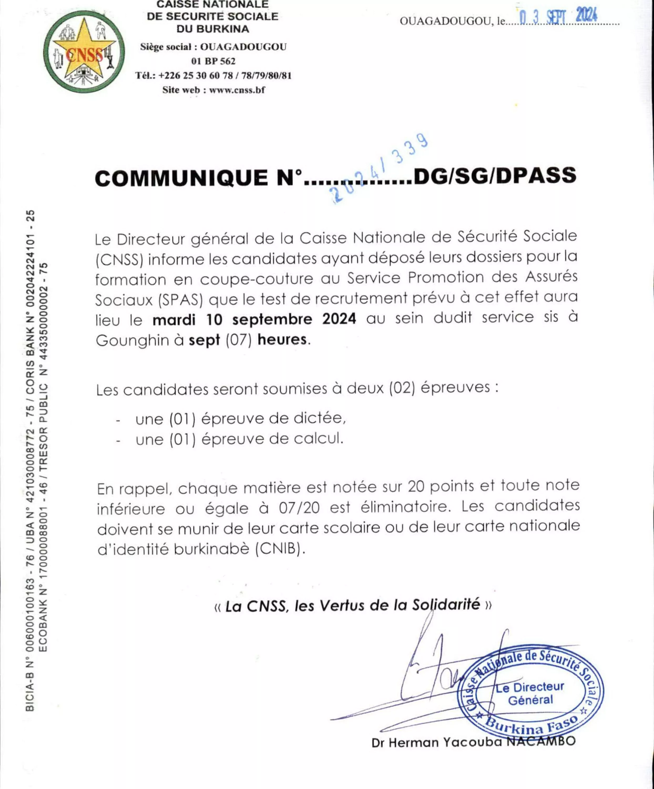 Résultats d’admission aux tests de recrutement de personnel de vingt-deux (22) profils au profit de la Caisse nationale de sécurité sociale, session 2024