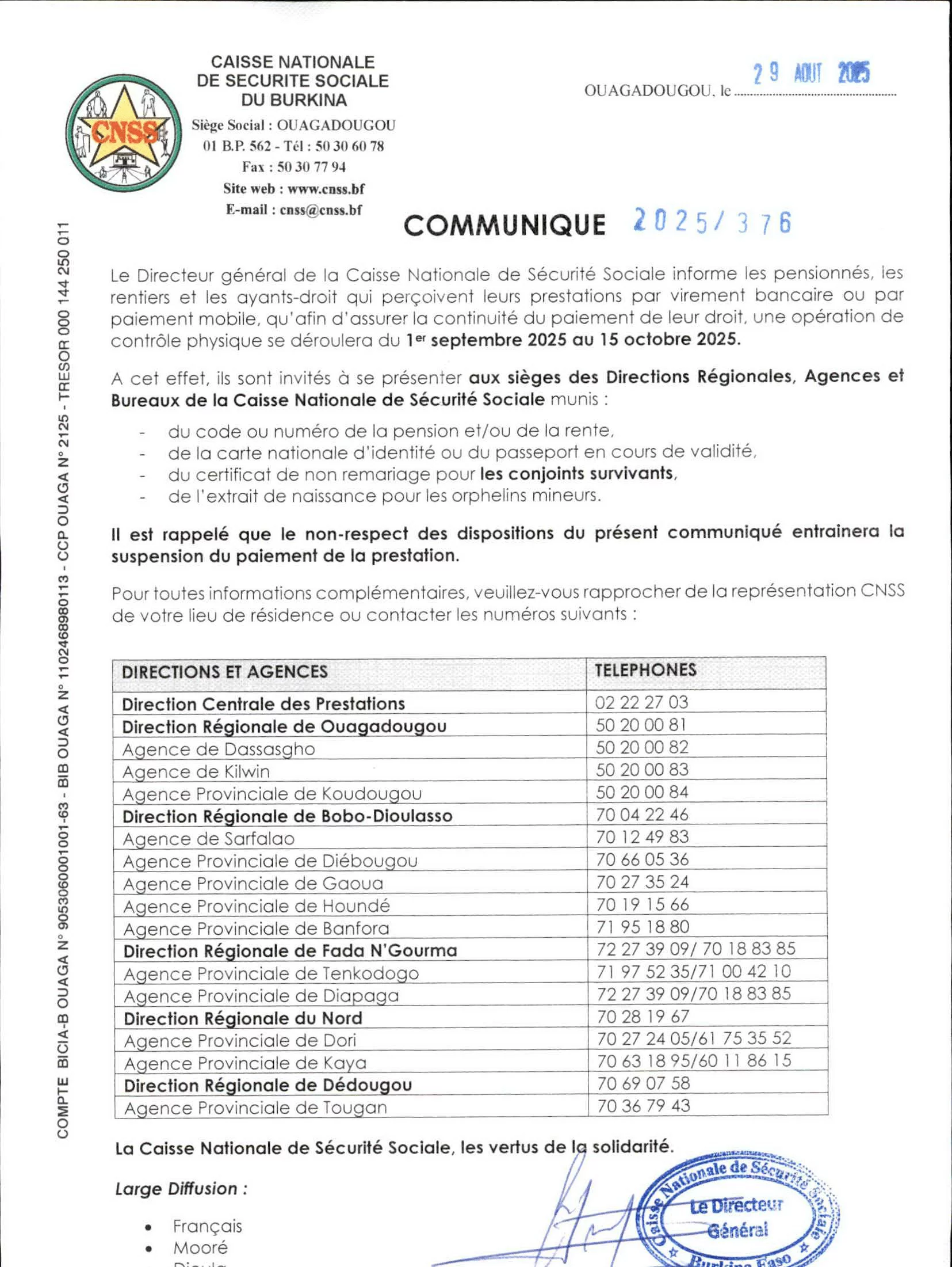 Communiqué relatif au contrôle physique des pensionnés, rentiers et ayants droit qui perçoivent leurs prestations par virement bancaire ou par paiement mobile