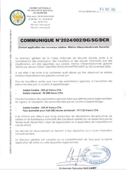 Communiqué N°2024/002/DG/SG/DCR portant application des nouveaux salaires Minima Interprofessionnels Garantis